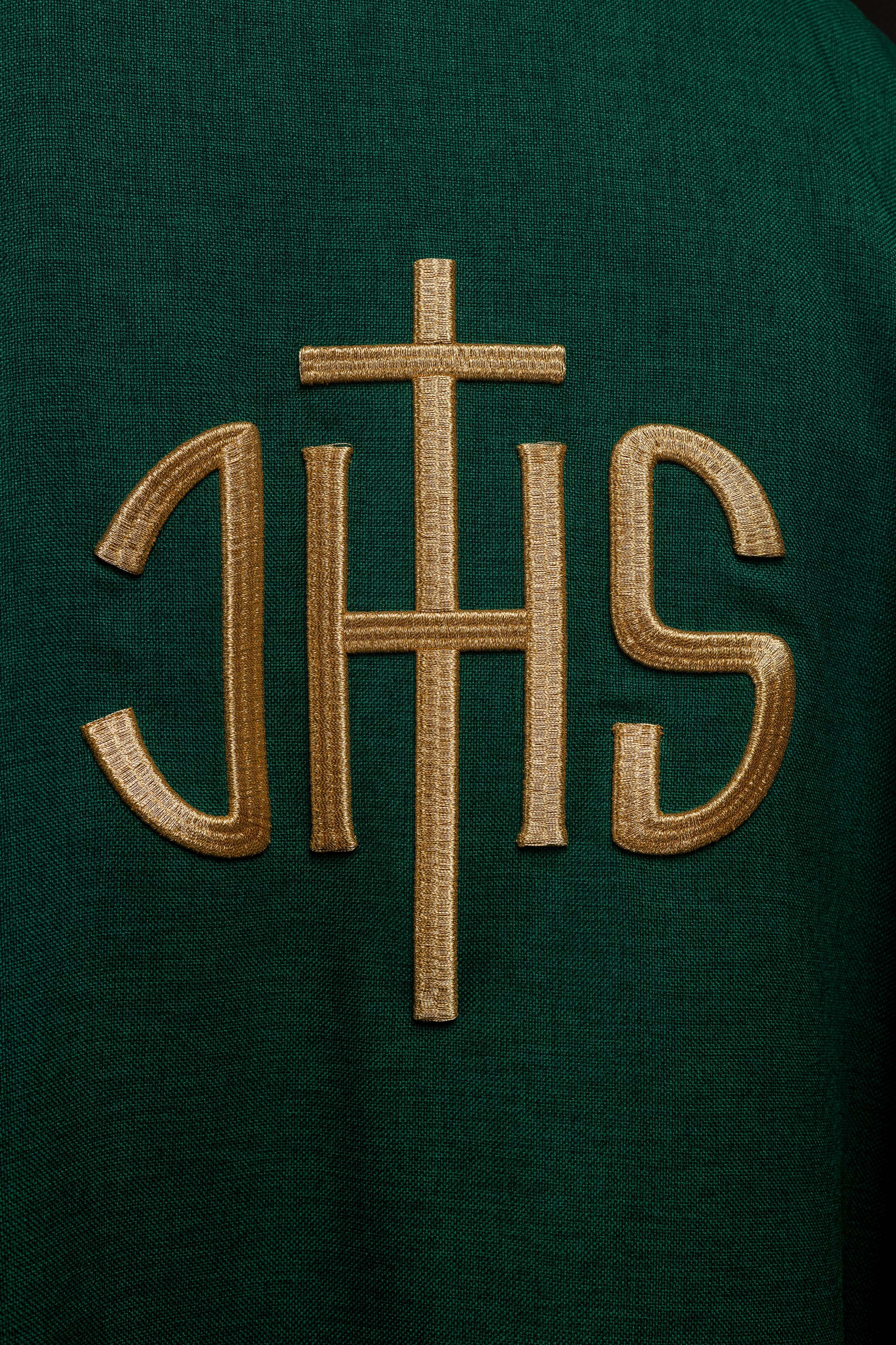 Casulla litúrgica roja con cinturón ricamente decorado con motivo floral e IHS